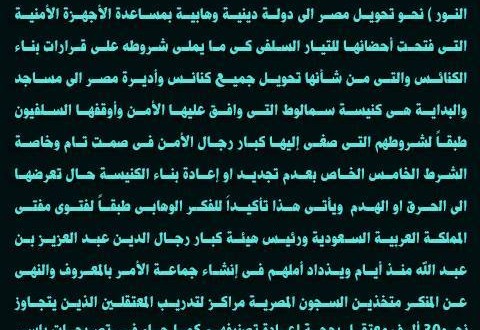 مازال العمل قائماً على قدم وساق نحو تحويل مصر الى دولة دينية وهابية بمساعدة الأجهزة الأمنية المصرية التى فتحت أحضانها للتيار السلفى كى ما يملى شروطه على قرارات بناء الكنائس والتى من شأنها تحويل جميع كنانس وأديرة مصر الى مساجد طبقاََ لما جاء لشروطهم بالموافقة على بناء كنيسة سمالوط وخاصة الشرط الخامس الخاص بعدم تجديد او إعادة بناء الكنيسة حال تعرضها الى الحرق او الهدم . وياتى هذا تأكيداََ للفكر الوهابى طبقاً لفتوى مفتى المملكة العربية السعودية ورئيس هيئة كبار رجال الدين عبد العزيز بن عبد الله آل الشيخ منذ أيام بضروروة هدم كل الكنائس فى الجزيرة العربية .
