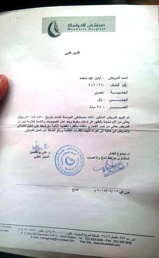 وقعت لى حادثة أدت الى إصابتى إصابة خطيرة فى العمود الفقرى ، قد تؤدى الى شلل نصفى على حسب تقرير الأطباء ، ولإيقاف كل هذا فلا بد من إجراء عملية جراحية ستتكلف مائة ألف ريال وأنا لا أمتلك تأمين صحى ، وكل ما ارجوه هو العودة الى مصر من إجل إجراء العملية هناك وسط أهلى ، لكن حتى هذه الأمنية ليست سهلة بالنسبه لى ، فهناك مشاكل بينى وبين كفيلى وهو يطلب منى مبلغ 13 ألف ريال حتى يقوم بإعطائى خروج نهائى.