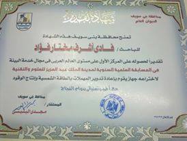 حصل فادى على العديد من الجوائز المحلية والعالمية من جهات مختلفة أهمها فوزه بالمركز الأول على مستوى الجمهورية في مسابقة المخترع الصغير وتسلمه شهادة تقدير من وزير التعليم لتفوقه ونبوغه، وحصوله على جائزة مدينة الملك عبد العزيز للعلوم بالسعودية والمركز الأول على مستوى العالم العربي.فادى اشرف مختار يحصد المركز الاول علي مستوى العالم العربي في احد اكبر المسابقات علي مستوى العالم في مجال البحث العلمى مسابقه جامعه الملك عبد العزيز للعلوم و التقنيه الدوليه في مجال خدمه البيئه و ذلك بعد فوزه بالمركز الاول علي مستوى الجمهوريه في مسابقه المخترع الصغير و ايضا تم اختياره كاصغر محكم دولى في احد اكبر المسابقات العالميه في مجال البحث العلمى .
