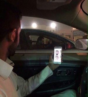 الصورة لشاب سعودى يقود سيارته وممسك بجواله والموضوع بواجهته الأمامية صورة المتهم نواف شريف العنزى غير مهتم بقيادته لسيارته ولكنه مهتم بالنظر لمن حوله ، لعله يكون فيهم نواف فيرشد عنه ويحصل على المليون ريال .