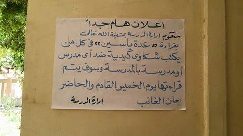 الإعلان يقول أن ادارة المدرسة ستقوم بقراءة “”عدة ياسين “” فى كل من يقوم بكتابة شكاوى كيدية ضد أى مدرس او مدرسة بالمدرسة وسوف يتم قراءتها يوم الخميس القادم والحاضر يعلم الغائب