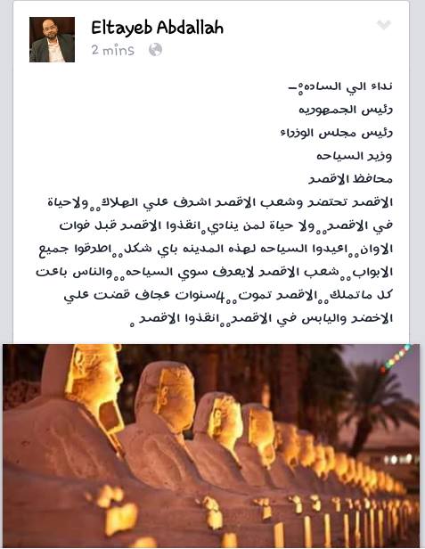 صرح نقيب المرشدين السياحيين باﻻقصر ا/ الطيب عبدالله من خلال صفحة التواصل اﻻجتماعي بالفيس بوك بأن اﻻحوال تزداد سوء في محافظة اﻻقصر حيث ان ﻻ يوجد مدخل رزق غير السياحه في هذه المحافظة ، وانه يرجوا من الساده المسئولين ومن رئيس الجمهوريه بسرعة التدخل ﻻنهاء هذه اﻻزمه بعمل حلول بديله ﻻنقاذ اهالي اﻻقصر خصوصا العاملين بالقطاع السياحي