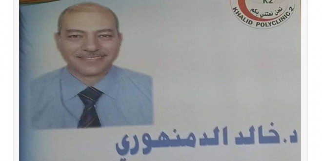 تنعى القنصلية العامة المصرية بجدة ببالغ الاسى الطبيب/ خالد فاروق عبد الحميد الدمنهوري، والذي وافته المنية نتيجة اصابته بطلق ناري من احد المواطنين السعوديين بمقر عمله بمجمع خالد الطبي بحي السامر بجدة.