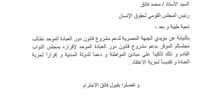 The Egyptian Front For Unified code for the construction of houses of worship Request the support of the National Human Rights Council