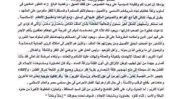 حيث هاجم الحكومة لتدخلها فى المعالجة الخاطئة لما يعرف بملف نصارى مصر على حد وصفهم ، تلك الطريقة التى ستؤدى الى تداعيات خطيرة لا يعرف أحد عواقبها، واصفا ذلك بسبب الأنا التى تضخمت لديكم للدرجة التى تجعلكم تشعرون بأنكم الأجدر بمعالجة الأمور التى تخص الدين ، ولقد تحملنا فى حزب النور الكثير من التخوين حتى لا نثير الفتنة ولا تنزلق الدولة الى آتون الفتنة وأن علماء حزب النور كان لهم الفضل الاول والأخير فى وقت الفتنة بمحافظة بنى سويف وأنهم وقفوا بالمرصاد ضد تهجير جميع نصارى قرى مركز الفشن بأكملها وأكتفوا فقد بتهجير ال 15 أسرة الذين أجرموا فى حق الإسلام ـ ثم هدد الحزب محافظ بنى سويف بسبب ما فعله مع أعضاء الحزب وان ردهم عليه وكيفية الرد سيحدده الحزب قريباً.