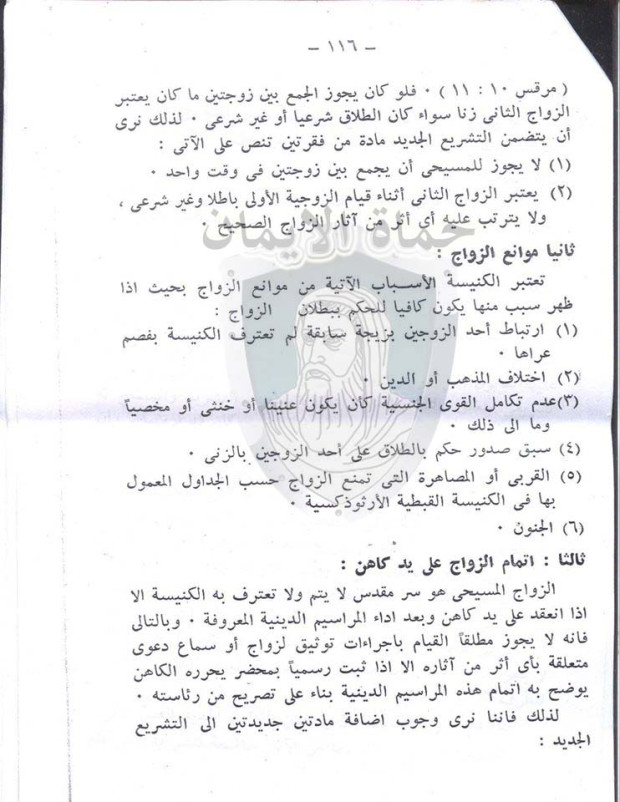 أو اقتراح سابق يتعارض معها حتى يأتى القانون الجديد موافقاً لمبادئ الدين وتعليم الكنيسة القبطية الأرثوذكسية.