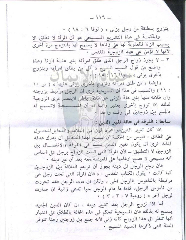 3-لا يجوز زواج الرجل الذى طلق امرأته بغير علة الزنا وهذا واضح من قول السيد المسيح “كل من يطلق امرأته ويتزوج بأخرى يزنى” (لوقا 16: 18).