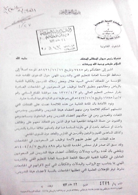 وأضاف أن نائب وزير الخدمة المدنية اعترف ضمنيًا في خطابه أن رئيس ديوان المظالم ردًا على الشكوى المقدمة منا بتزوير المؤسسة للمسمى الوظيفى في عقد التوظيف وامتناع وعدم تنفيذ ومخالفة مسؤولى المؤسسة للأنظمة واللوائح المذكورة ومخالفة المؤسسة بنود عقد التوظيف ورأى تسوية الوضع.