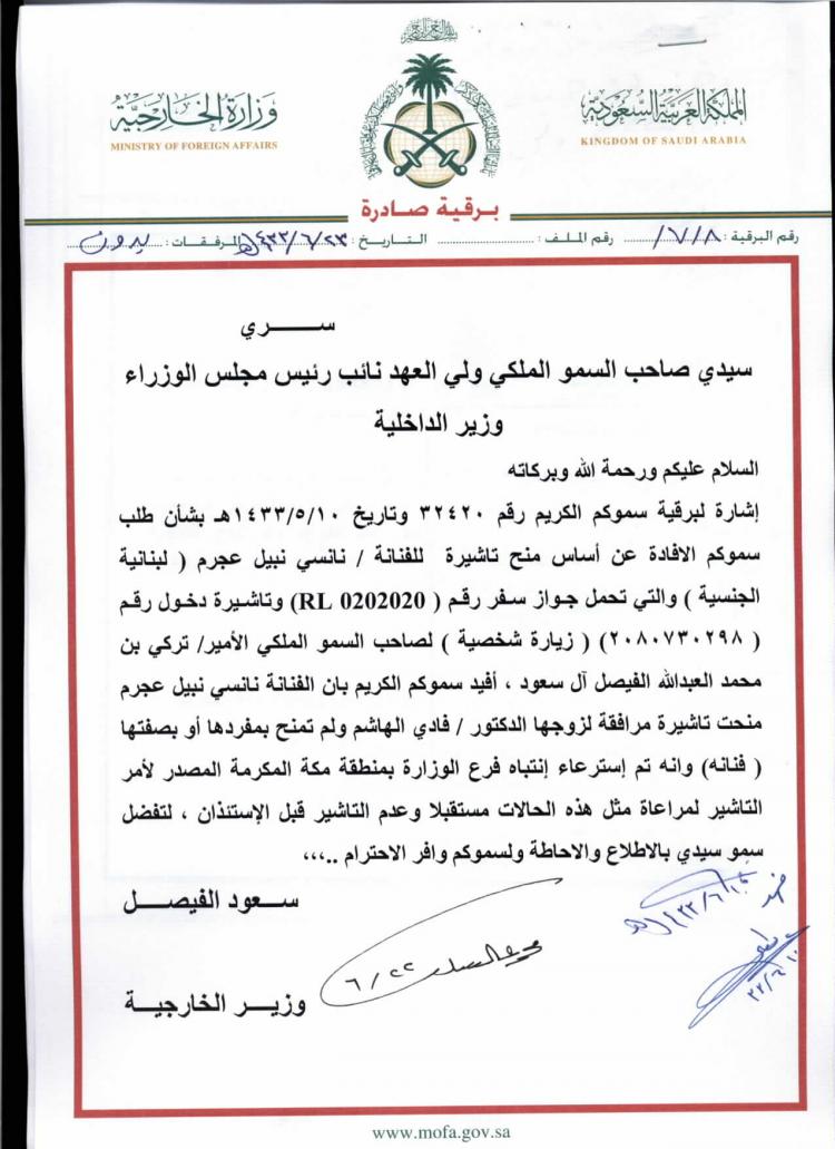 وفي خطاب إلى وزير الداخلية آنذاك، قال وزير الخارجية السعودي حينها، سعود الفيصل، إن نانسي منحت تأشيرة مرافقة لزوجها فادي الهاشم، ولم تمنح بمفردها أو بصفتها «فنانة».