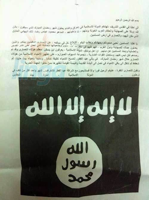 اصدر الدولة الاسلامية في العراق بيان والشام، يهنئ فيه أهالي القدس المسلمين بحلول شهر رمضان ويطالبهم بالابلاغ عن بيوت المسيحيين (النصارى) لتطهير الاحياء الاسلامية منهم خلال شهر رمضان. وجاء في البيان: الى أهلنا في القدس الشريف، تهنئكم الدولة الاسلامية في العراق والشام بحلول شهر رمضان المبارك الذي سيكون باذن الله وبالا على الصهاينة والحكام العرب الخونة ومنهم، بل واخونهم، المدعو محمود عباس رضا، ذلك البهائي المارق الذي مكن اليهود والنصارى في أرض المسلمين. يا أهلنا المسلمين، نحيي صمودكم وجهادكم ونطلب اليكم، الابلاغ، كل في موقعه، عن النصارى المقيمين بينكم، والذين يعملون عملاء للصهاينة ودول الغرب، فهم كلهم في سفارات هذه الدول وجمعياتها الخائنة التي تعمل على نشر الفسق والعلمانية وابعاد المسلمين عن دينهم. ان اهل دولتكم، الدولة الاسلامية، يعرفون اين يسكن معظم هؤلاء النصارى وقد تم رصدهم لكن ليس كلهم. وستعمل القوات الضاربة – مجموعة السيوف الصوارم – على تطير الأحياء الاسلامية من هؤلاء النصارى خلال شهر رمضان المبارك، كي يأتي عيد الفطر، لتصبح الاحياء نظيفة تماما. وسنبدأ بأحياء بيت حنينا، ثم شعفاط ثم الى باقي الاحياء كي نصل الى البلدة القديمة وكنيسة القيامة لنطهرها ممن خانوا العهدة العمرية. ونقول للنصارى الكفرة، عليكم الرحيل فورا والا فستذبحون مع اشراقة عيد الفطر كالخراف… شهر واحد أكثر من كاف كي ترحلون