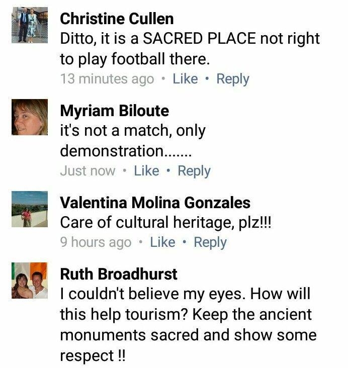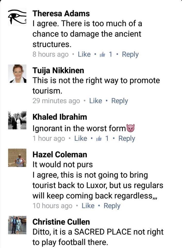 في ردود فعل عالمية متباينة استنكارية حول قيام بعض اللاعبين المصريين بلعب كرة القدم فى معبد الكرنك بهدف الدعاية والترويج السياحي بعد حادثة الكرنك الارهابية،يبدوا ان الرياح أتت بما لا تشتهى السفن ،أو بالأحرى حلت لعنة الفراعنة مدوية على من قاموا بهذا الفعل المتجاوز في الحضرة الملكية المقدسة اللتى كان الملوك العظام وكهنتهم يرتجفون خوفاً وينحنون إحتراماً بل ويغتسلون ويتطيبون ويخلعون نعالهم عندما يقومون بزيارة المعبد اللذي بنوة بأقسي الحجارة كى يبقى شامخاً باثقاً في قلب التاريخ فى حين بنوا بيوتهم بالطين لتفنى بفنائهم!!بل جعلوا معابدهم فى الشرق لتكون كالشمس يستمدون منه الدفء لقلوبهم والنور والبركات لحياتهم،وجعلوا مقابرهم في الغرب للمغيب والرقود فى سلام فى انتظار البعث مرة اخرى من الشرق ،يبدوا أن الرساله اللتى اراد الاعبين توصيلها للعالم كى يأتوا للاقصر في سلام،كانت أقل سرعة في الوصول والتأثير من لعنات الفراعنة اللتى ضرب مداها كل الانحاء وكأن فحواها يقول (من أراد أن يدعوا للسياحة و للسلام فلا يزعج الملوك العظام)(السياحة لن تأتي بإنتهاك قدسيتنا)(تريدون سلاماً فلم تعكرون سلامنا)!!وتراوحت ردود الافعال ما بين مستنكر ومندهش ومنفعل ومتهكم فهاهي Theresa Adams تقول متهكمة(اوافق على ذلك فهناك العديد من الفرص لتحطيم كل ماهو قديم وخالد)!! وهاهي tuija nikkinen تقول غاضبة(انها ليست الطريقة الصحيحه للدعوة للسياحة) ويقول Hazel Coleman (تلك الطريقة لن تنفع على الاطلاق ولكننا كسائحين دائمين سنأتى على ايه حال-تحياتي) ويقول Christine Cullen منزعجاً(إنة لمكان مقدس لا يصح على الاطلاق لعب الكره فيه)!! وتقول Myriam Biloute متسائلة(الأمر لايعدوا كونه الا مظاهرة اكثر من ان تكون مباراة)! وتقول Valentina Molina Gonzales صارخة ومتوسلة(حافظوا على الحضارة الفرعونية أرجوكم)!! ويقول Ruth Broadhurst منزعجاً(لا استطيع ان اصدق عيني!!كيف من الممكن ان يساعدا هذا في عودة السياحة!احفظوا للاماكن الاثرية قدسيتها واظهروا بعض الاحترام!!) واخيرا تصدمنا Marielle Villermet قائلة بعبارة حزينة ساخطة(مفيش إحترام)!!