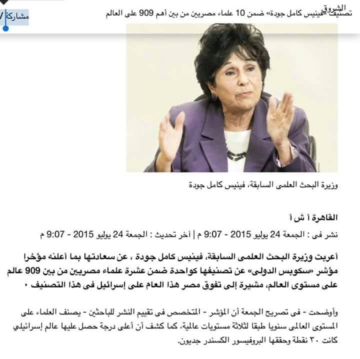 يتقدم المفكر الإقتصادى ناصر عدلى محارب وصاحب مبادرة الدبلوماسية الشعبية لسداد ديون مصر باسمى التهانى القلبية الصادقة الى السيدة الفاضلة والمصرية الأصيلة والوطنية المخلصة الاستاذة الدكتورة فنيس جودة كامل بإختيارها ضمن افضل عشرة علماء مصريين من بين 909 عالم على مستوى العالم ، واذ نهنئ انفسنا ونهنئ الشعب المصرى كلة بهذا التقدير ، نتمنى أن تكونى القدوة والمثل الذى يحتذى بة شباب مصر ، وندعو سيادتك أن تكونى رمزا من رموز الدبلوماسية الشعبية لسداد ديون مصر للمساعدة فى أسقاط وسداد ديوننا الخارجية .