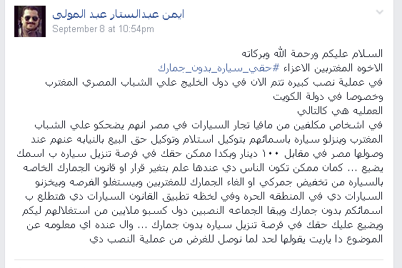 في اشخاص مكلفين من مافيا تجار السيارات في مصر انهم يضحكو علي الشباب المغترب وينزلو سياره باسمائهم بتوكيل استلام وتوكيل حق البيع بالنيابه عنهم عند وصولها مصر في مقابل ١٠٠ دينار وبكدا ممكن حقك في فرصة تنزيل سيارة ب اسمك يضيع … كمان ممكن تكون الناس دي عندها علم بتغير قرار او قانون الجمارك الخاصه بالسياره من تخفيض جمركي او الغاء الجمارك للمغتربين وبيستغلو الفرصه وبيخزنو السيارات دي في المنطقه الحره وفي لخظه تطبيق القانون السيارات دي هتطلع ب اسمائكم بدون جمارك ويبقا الجماعه النصابين دول كسبو ملايين من استغلالهم ليكم ويضيع عليك حقك في فرصة تنزيل سيارة بدون جمارك … وال عنده اي معلومه عن الموضوع دا ياريت يقولها لحد لما نوصل للغرض من عملية النصب دي