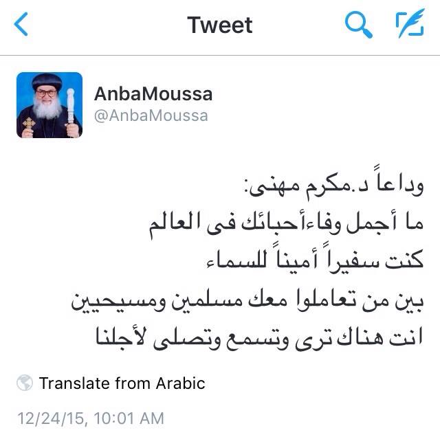 ودع نيافة الأنبا موسى الأسقف العام للشباب صديقه والخادم اﻻمين د.مكرم مهنى الى مثواه الاخير .من البطرسية الى مدافن اﻻسرة والعزاء مساء فى كنيسة العذراء بالزمالك .