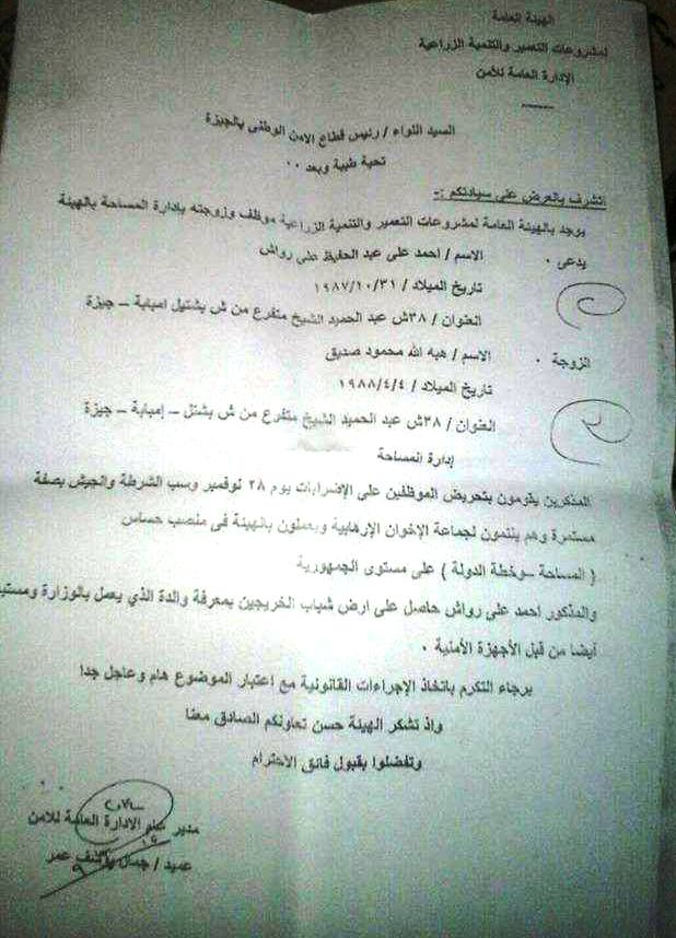 واكدت المذكرة الموقعة من العميد جمال يوسف عمر رئيس مجموعة الامن بالوزارة ان احمد على رواش نجل رئيس الادارة المركزية حاصل على ارض شباب الخريجين ويعمل بهيئة التعمير هو وزوجته ويقودان تظاهرات