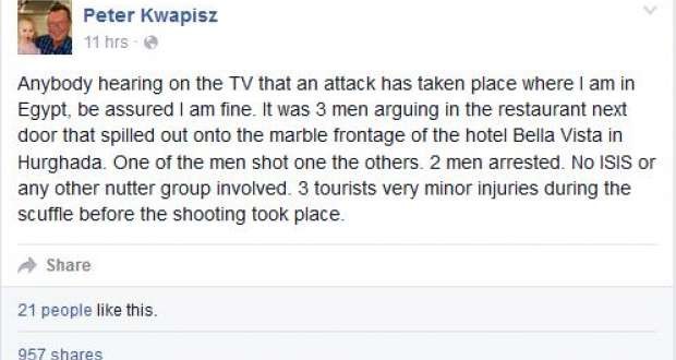 روى أحد السياح وشاهد عيان على حادث الغردقة التي وقعت ليلة أمس، تفاصيل ما حدث عبر صفحته الشخصية على موقع التواصل الاجتماعي “فيس بوك” وكتب:”إلى كل من يستمع إلى خبر الهجوم على فندق الغردقة في التليفزيون اطمئن أنا بخير، وما حدث هو أنه كان هناك 3 رجال يتجادلون في المطعم المجاور للفندق وواحد منهم قتل أحد الأفراد، واعتقل الاثنان الآخران وأصيب 3 سياح بجروح طفيفة”.