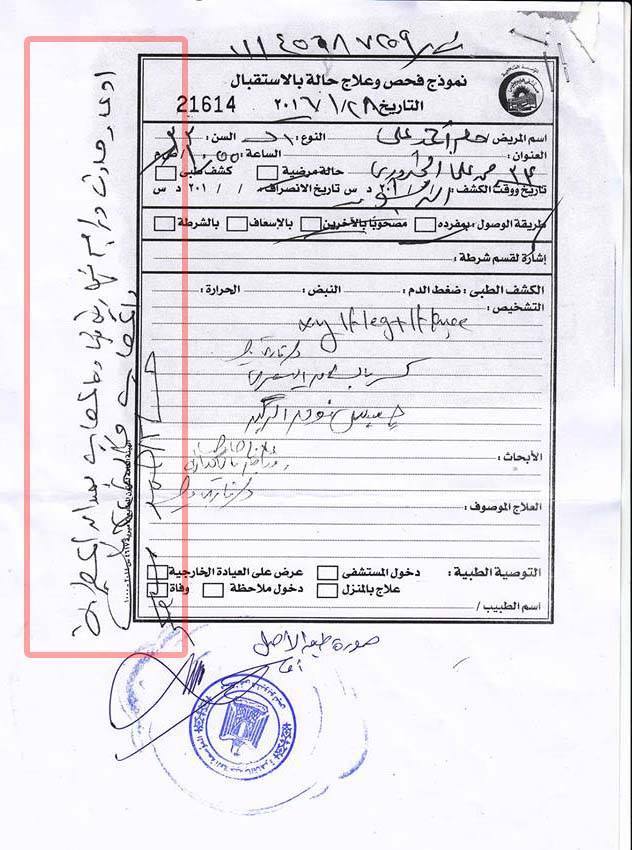 ثم حضر مرة أخرى في نفس اليوم بناءً علي خطاب موجه من قسم المطرية لتوقيع الكشف الطبي علي الامين حسام احمد علي وبناء عليه تم توقيع الكشف الطبي عليه مرة أخرى بواسطة طبيب الاستقبال بتذكرة نموذج فحص وعلاج بالاستقبال الساعة 12.15 ظهراً الذي أفاد بوجود اشتباه كسر بالساق اليسري وجرح قطعي بالساق اليسري طوله حوالي 2 سم وتم عرضه علي استشاري العظام والذي قام بالكشف عليه وأفاد بوجود كسر بالساق اليسري , وبناء عليه قد قامت المستشفي بالتعامل مع المذكور أنه ادعاء حادث كما هو مثبت من المذكور. ولم تتم الاشارة في التقرير الي اي ادعاء مشاجرة او ان الكسر ناتج عن مشاجرة كما أكد الامين أمام النيابة .
