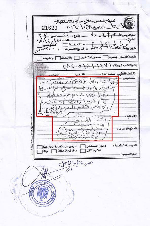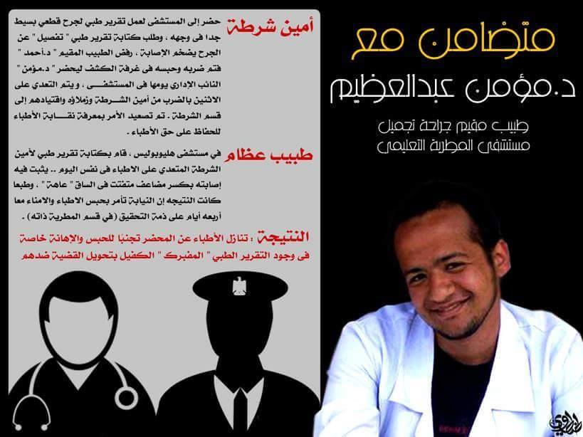 بناء علي طلب رسمي من النقابة العامة للأطباء قامت مستشفي هليوبولس صباح اليوم بإرسال صورة طبق الأصل من نموذج فحص وعلاج حالة أمين الشرطة / حسام احمد علي والذي إدعي الاعتداء عليه من قبل أطباء مستشفي المطرية .