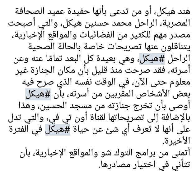 النهاردة لما توفي حسنين هيكل، جريدة الوطن نقلت على لسانها تصريح تحت عنوان حفيدة هيكل تؤكد وفاته، وكمان عملت مداخلة مع قناة أون تي في النهاردة والمذيع بيسألها عن حياته الأخيرة أثناء فترة مرضه وأسرته بتتمني من الحكومة تعمل ايه، بس هي عشان مش حفيدته معرفتش تقول حاجة، والمذيع نهى المكالمة خلال 3 دقايق، ونيجي بقى للمشكلة الأكبر ان حسنين هيكل كان موصي أسرته أنه جنازته تخرج من مسجد الحسين، يعني معروف مكان الجنازة من قبل ما يموت هيبقى فين.. هي بقى قالت في تصريحات النهاردة حوالي الساعة 2 كده إن لسه محددناش مكان الجنازة.