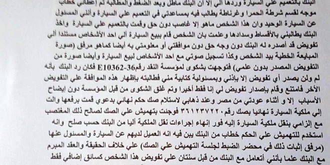 حيث أنني قد قمت بشراء سيارة من البنك العربي بنظام التأجير والمنتهي بوعد بالتملك في تاريخ 7/7/2012وعند مرضي قمت بإصدار تفويض قيادة للمدعو جمال يحي عبد المجيد حسانين مصري الجنسية إقامة رقم2068087812كسائق إضافي حسب الصلاحيات الممنوحة لي من البنك بما إنني المستخدم الفعلي وذلك لمدة ستة أشهر تبدأ من شهر 1/2014 م وتنتهي شهر 7/2014 م وبعد انتهاء مدة التفويض ومطالبتي للشخص باسترداد السيارة كما هو مبين في الرسائل التليفونية المرفقة اخذ في المماطلة وامتنع عن تسليمها فاضطررت ألي الذهاب ألي البنك وتقديم شكوى لدية ومطالبة البنك بالتعميم علي السيارة وردها لى إلا أن البنك ماطل وبعد الضغط والمطالبة تم إعطائي خطاب موجه لقسم شرطة الحمرا وغرناطة يطالب فيه بمساعدتي في التعميم علي السيارة وأنني المسئول عن السيارة الوحيد وان هذا الشخص ماهو إلا غاصب دون حق وقمت بالتعميم علي السيارة واخذ البنك يطالبني بالأقساط وسدادها وعلمت بان الشخص قام ببيع السيارة ألي احد الأشخاص مستندا ألي تفويض قد أصدره له البنك دون وجه حق دون موافقتي أو معلومتي به أيضا كماهو مرفق (صورة المبايعة الخطية بيد الشخص وكذا تسجيل صوتي مع احد الأشخاص لبيع السيارة وأيضا صورة من التفويض المصدر بدون علمي) فتوجهت بشكوى لمؤسسة النقد رقمE10362-36 فكان رد البنك بأنه لم ولن يصدر أي تفويض إلا بإذني وبمسئولية كتابية مني فطالبته بإظهار هذه الموافقة علي التفويض الأخر فامتنع وقام بإصدار تفويض لي إنا فقط أخيرا وتم غلق الشكوى من قبل المؤسسة دون إيضاح الأسباب إلا و أثناء عودتي من مصر وعند ذهابي لاستلام صك حكم نهائي بدعوي قمت برفعها والت إلي ملكية السيارة نهائيا بصك رقم361237220 فوجئت بتهميش علي الصك لصالح ذلك المغتصب مع إلزامي بنقل ملكية السيارة إليه فور إنهاء إجراءات نقل الملكية أليا من البنك حسب صلح وانه استخدم للتهميش علي الحكم خطاب من البنك يبن فيه انه العميل لديهم عن السيارة والمسئول عنها (مرفق إثبات ذلك في محضر الضبط لجلسة التهميش علي الصك) علي خلاف الحقيقة والعقد المبرم مع البنك علما بأنني أتعامل مع البنك من قبل سنتان علي تفويض هذا الشخص كسائق إضافي فقط وكنت عميل من الدرجة الأولي وكذا حسب العقد المبرم بيننا وكذا الخطاب الموجه من البنك لقسم الحمرا مما أدي ألي التهميش علي الصك وإيقاف الحكم وقد تم ذلك وأنا خارج البلاد ولم يكتفي البنك بذلك فقط بل كان البنك قبل تلك الفترة يطالبني بنقل ملكية السيارة ويتوجه لي بالشكر علي إنهاء الإقساط وعندما رفعت التماس للتهميش علي الصك وذهبت لنقل ملكية السيارة حسب بنود العقد ومطالبة البنك فوجئت بان البنك قد قام بنقل ملكية سيارتي الي الشخص المذكور علما بان صك الحكم النهائي لصالحي وان جميع الأحكام لاتلزم ولم تطلب نقل ملكية السيارة إلا أليا كما اقر صك الحكم النهائي الواجب النفاذ برقم 361237220 يقر بأنني المالك الوحيد والمنتفع الوحيد لهذه السيارة (دعوي استرداد حيازة المقيدة بمحكمة العامة برقم 371565862)فالعجيب والغريب لماذا يقوم البنك بتلك الأفعال الفجة ومساعدة شخص والتسهيل له لاغتصاب حقوق الغير وهل هي حالة وحيدة أم حالات متكررة أهذه الأمانة التي نحمله أيها وتعهد بالحفاظ عليها .