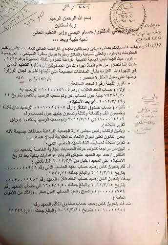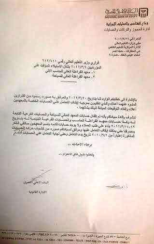 حيثُ أنهما قاما بالاستيلاء على أموال المعهد وصرف مبالغ وإجراء تحويلات بأرصدة هذه الحسابات إلي حسابات أخري غير معلومة بعد تاريخ صدور القرار الوزاري رقم 612 بتاريخ 6-3-2012 بالاستيلاء على المعهد وقد ترتب علي هذا إغلاق حسابات المعهد وأصبحت أرصدته “صفر” بتاريخ 14-3-2012 .