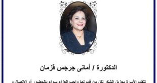 تتقدم أسرة الدكتورة أماني جرجس قزمان بالشكر لمن قدم لها واجب العزاء في رحيلها سواء بالحضور أو الاتصال، وتدعو الأسرة كل الأهل والأصدقاء لحضور القداس الألهي في ذكري الأربعين يوم السبت الموافق ٢٢ يونية في تمام الساعة الثامنة والنصف صباحا، بكنيسة السبع مذابح بميسيساجا وعنوان الكنيسة: 6341 Mississauga Road ON …