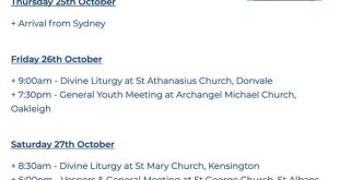أشرف حلمى تلبية لدعوة نيافة الحبر الجليل الانبا سوريال أسقف إيبارشية ملبورن وتوابعها يلتقى الانبا أغاثون أسقف البرازيل شعب وشباب الايبارشية خلال زيارتة ملبورن التى من المقرر وصوله مساء بعد غد الخميس قادماً من سيدنى وقد أعدت الايبارشية برنامجاً خاصاً للزيارةعلى النحو التالى . الجمعة ٢٦ أكتوبر : القداس الالهى …