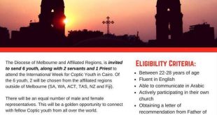 أشرف حلمى افصح نيافة الحبر الجليل الانبا سوريال أسقف ملبورن وتوابعها عن دعوة قداسة البابا تواضروس الثانى بابا الإسكندرية وبطريرك الكرازة المرقسية الى٢٠٠ من شباب الاقباط لحضور الأسبوع العالمى للشباب القبطى الأرثوذكسى من جميع الإيبارشيات القبطية داخل مصر وخارجها فى الفترة من ٢٥ أغسطس الى الاول من سبتمبر ٢٠١٨ وذلك …