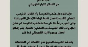 كتبت جورجيت شرقاوى أصدرت الكنيسه بيان رسمي بخصوص اللوحه الكهربائيه بكنيسه مكسيموس و دوماديوس بمنطقه سيدي بشر بشرق الاسكندرية ، ذكرت فيه ،بخصوص ما حدث منذ قليل خلال نهضه السيدة العذراء من انقطاع للتيار الكهربي ،فأننا ننوة علي شعب الكنيسه بان الكابل الرئيسي المغذي للكنيسه فصل نتيجه زيادة الاحمال الكهربائية …