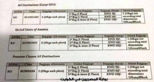 الخطوط الجوية الكويتية تحدد شروط جديدة للحقائب التي برفقة المسافرين اعتباراً من شهر فبراير. الحد المسموح به على متن الخطوط الجوية الكويتية للدرجة السياحية حقيبة واحدة لا يتجاوز وزنها 23 كيلو لجميع الوجهات عدا الولايات المتحدة الأمريكية. الحد المسموح به للدرجة السياحية للولايات المتحدة الأمريكية هو حقيبتين لا يتجاوز وزن …