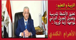 متابعة / أمل فرج قرر الدكتور طارق شوقي، وزير التربية والتعليم والتعليم الفني، تعليق الأنشطة المدرسية وتعديل الجدول المدرسي. جاء ذلك حرصًا من الوزارة على صحة وسلامة أبنائنا الطلاب، واتخاذ الإجراءات الاحترازية اللازمة لمواجهة فيروس كورونا المستجد. ووجه الوزير، مديري المديريات التعليمية بالتأكد من توافر الشروط الصحية للوقاية من فيروس …