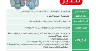 حذرت هيئة الغذاء والدواء بالسعودية من انتشار أنواع معينة من زجاجات المياه بالأسواق وخاصة بالمدينة المنورة ، تلك المياه التى ينتجها مصنع الدار البيضار للمياه والعصائر لتجاوزه الحد الأقصى من استخدام مادة البرومات . وجاء التحذير من استخدام مياه روكان ومياه الدار البيضاء ذات الأحجام ( 200.330. 600 مل ) …